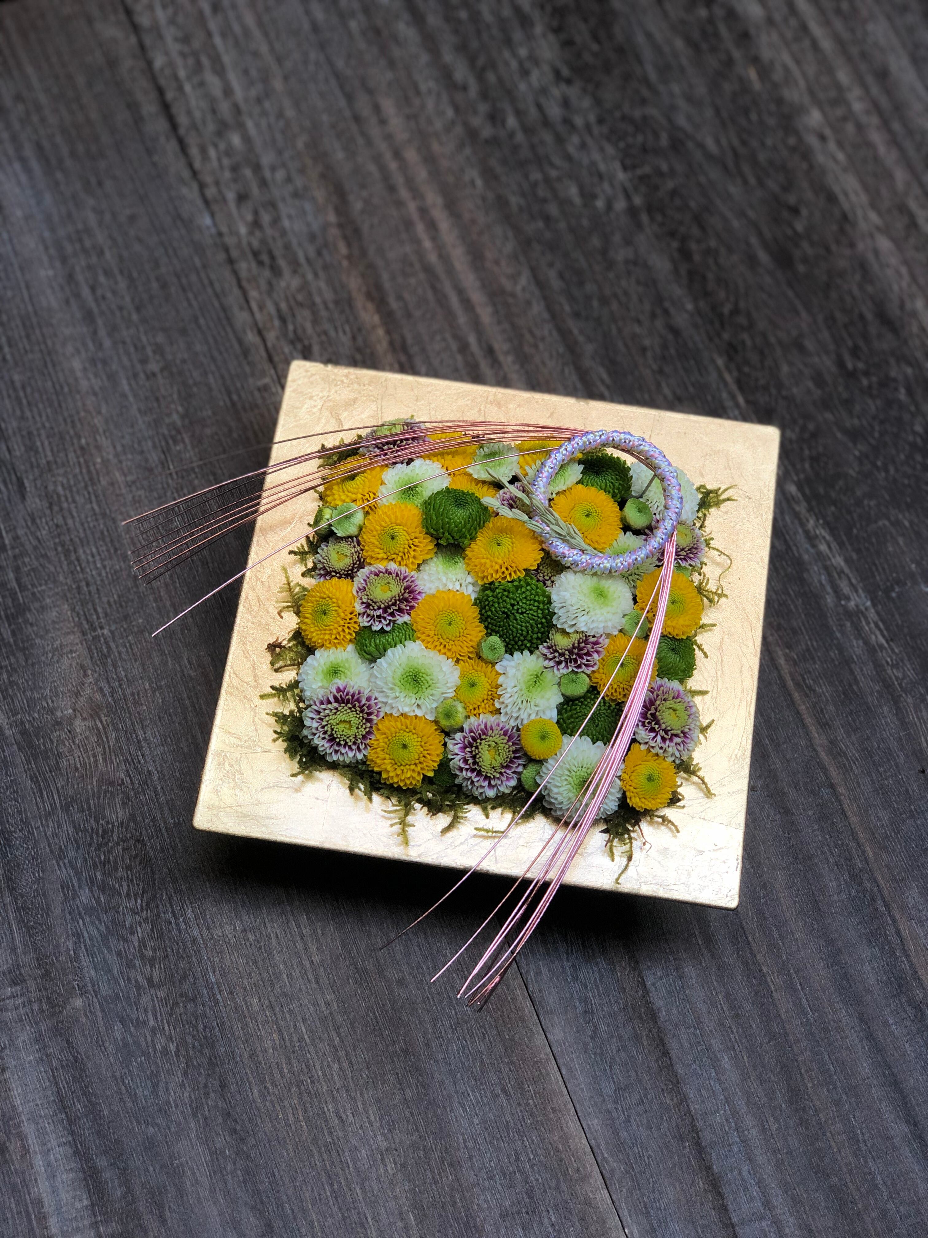 縁起のよい金色にコーティングされた器に、白と黄色とピンクに緑と色とりどりの、か〜わいいぽんぽんマムを、これまた縁起のよい苔のベースにつめ込みました