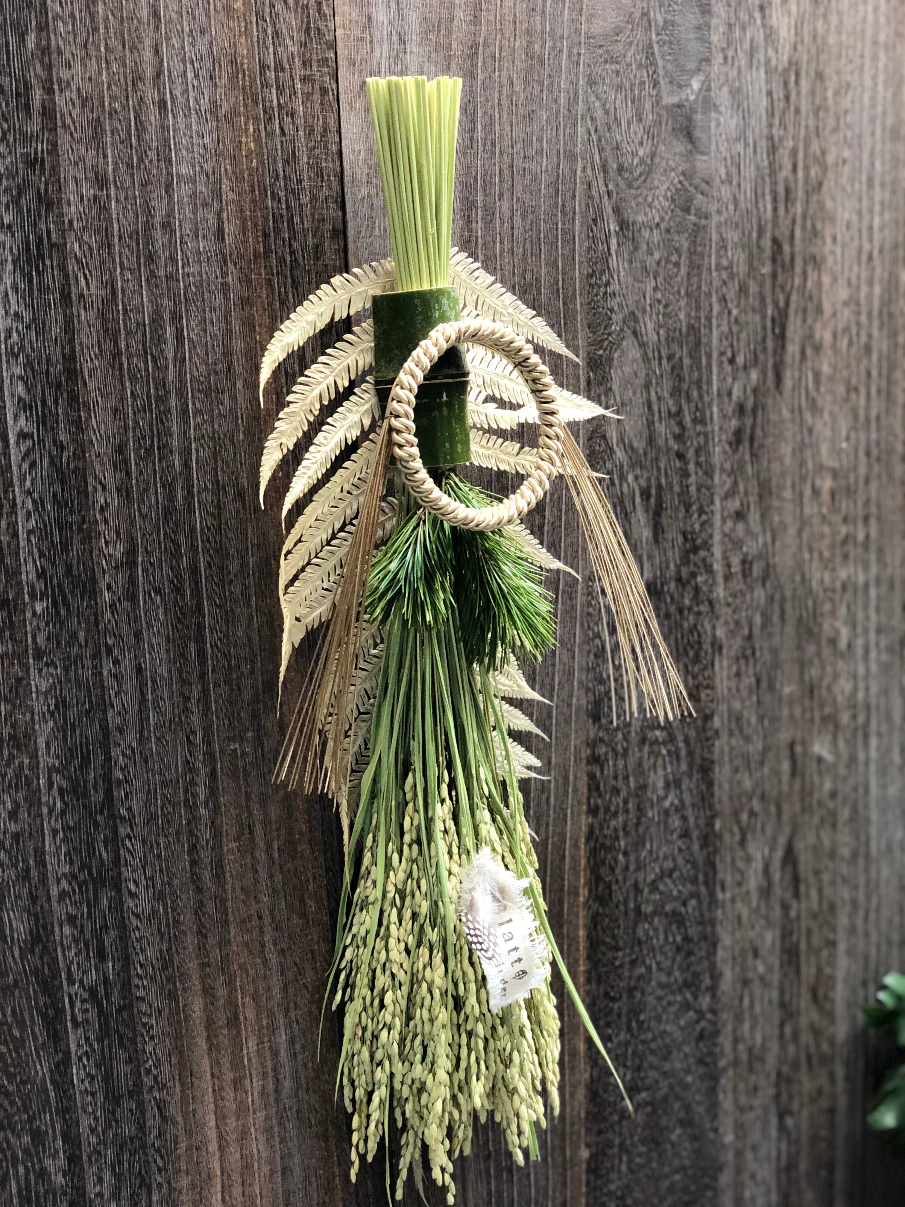 豊穣の象徴である稲穂を、節入りの竹でたばね松葉をアクセントにしたデザインになってます