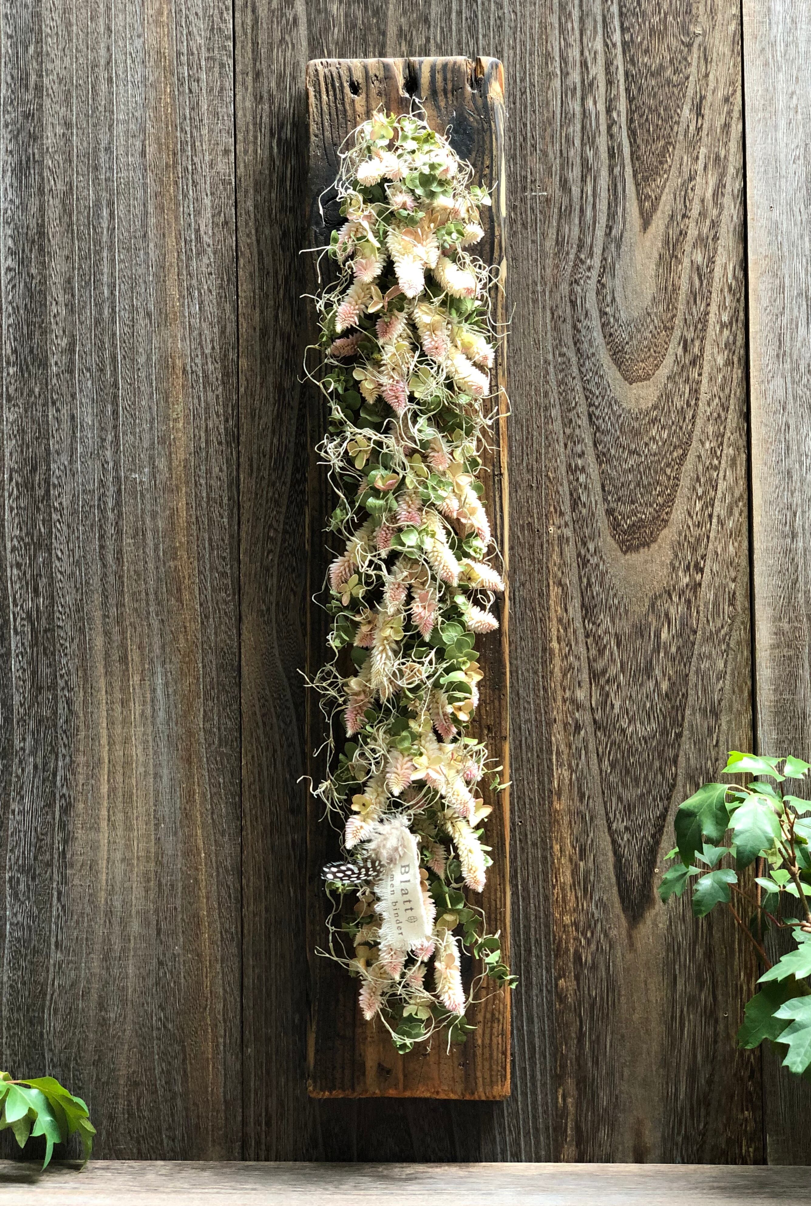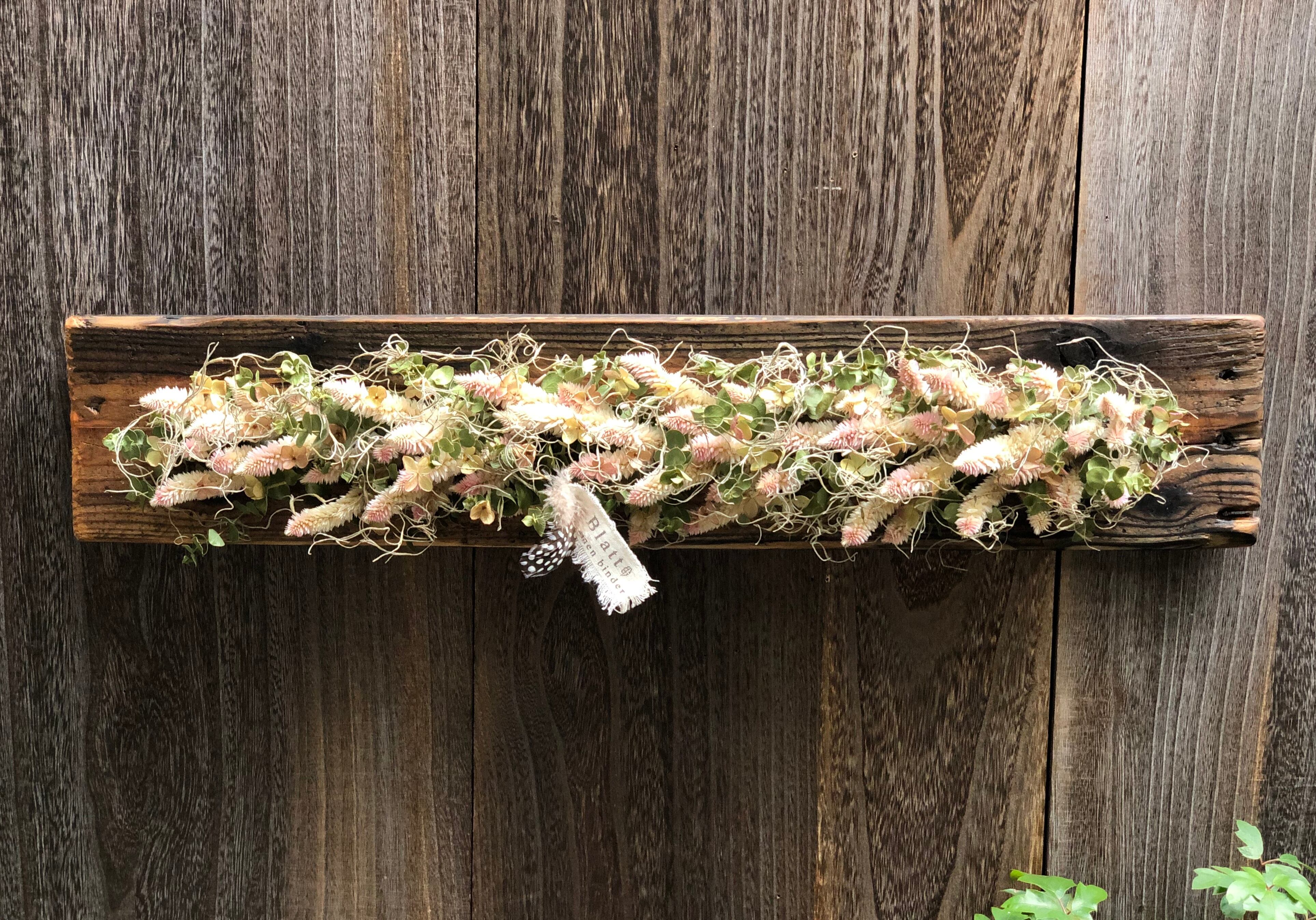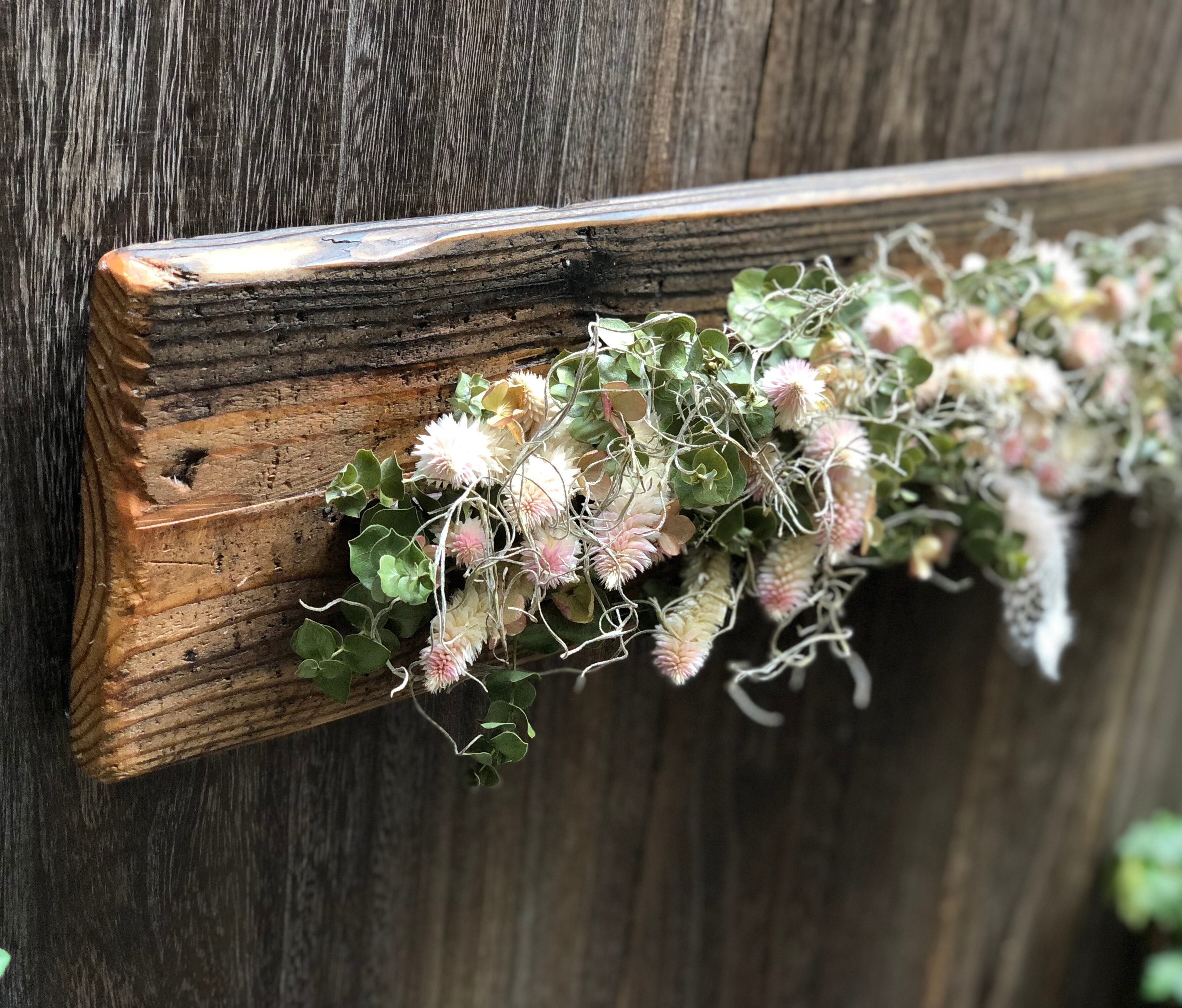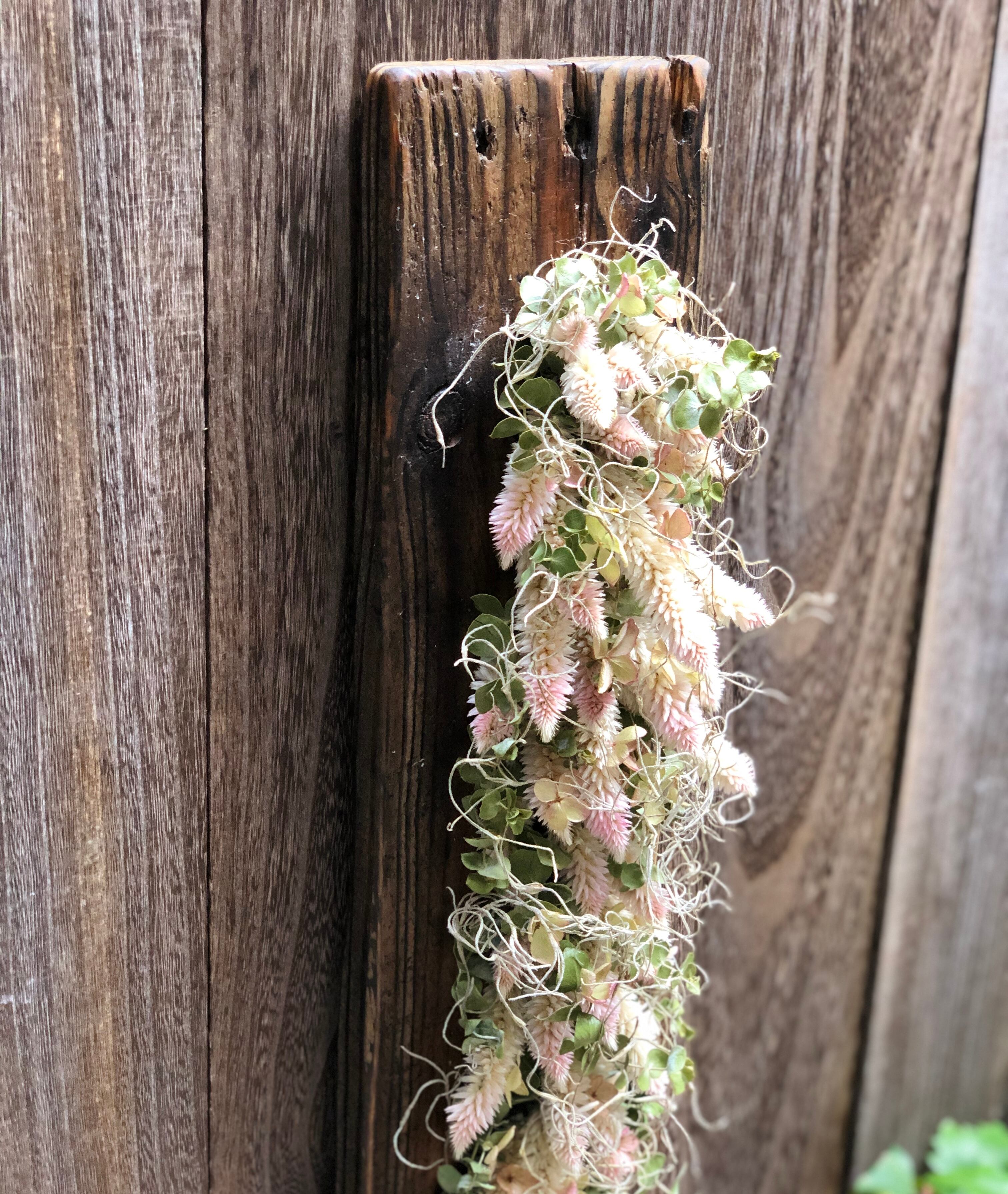 グレイッシュなユーカリにあま〜いピンクのセロシアとミナヅキ、そしてスパニッシュモスのドライで制作してます