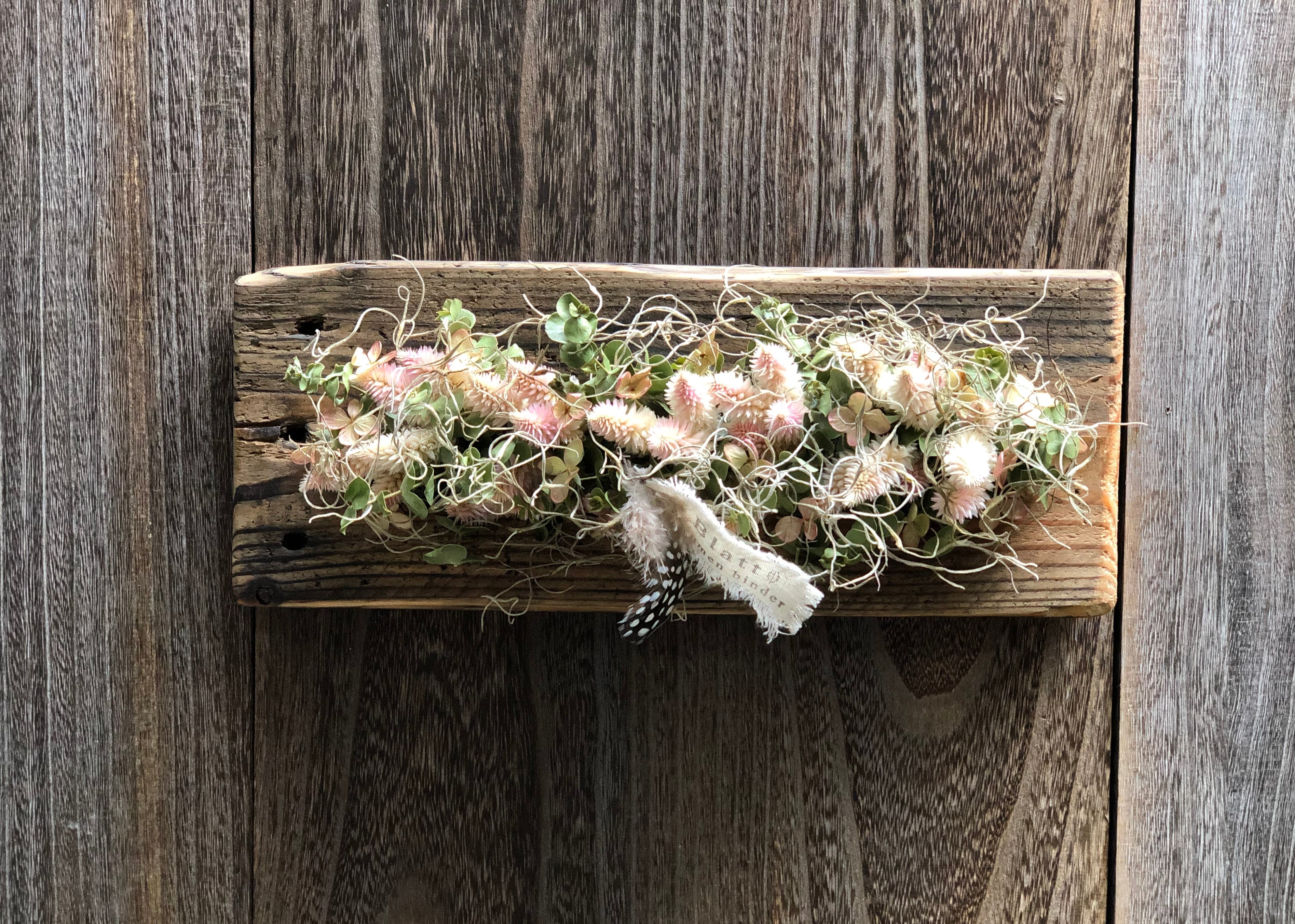 グレイッシュなユーカリにあま〜いピンクのセロシアとミナヅキ、そしてスパニッシュモスのドライで制作してます