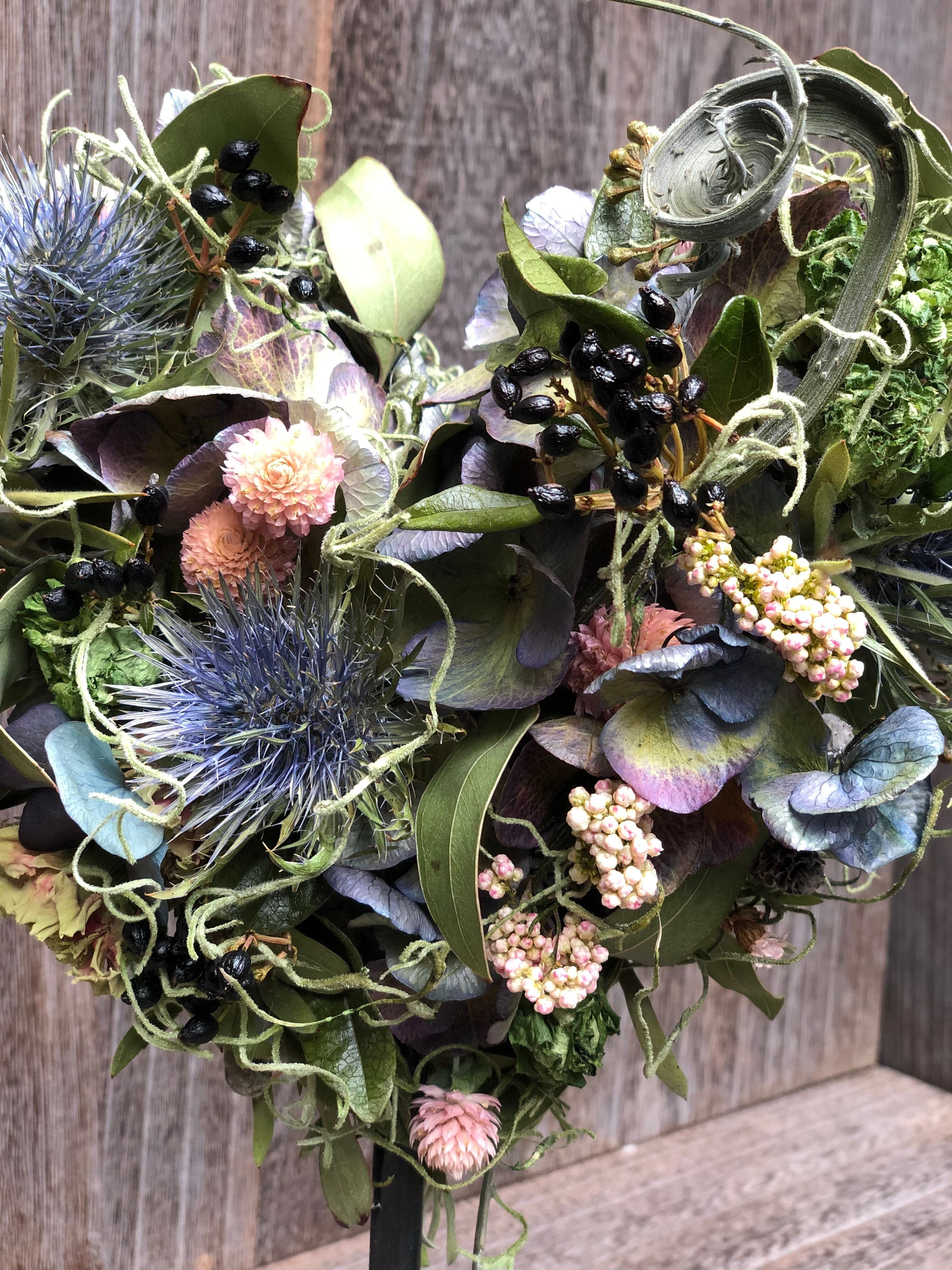 色あいは、深みのあるアジサイとエリンジウムに映えるようにピンクのセンニチコウとライスフラワーをアクセントにしました