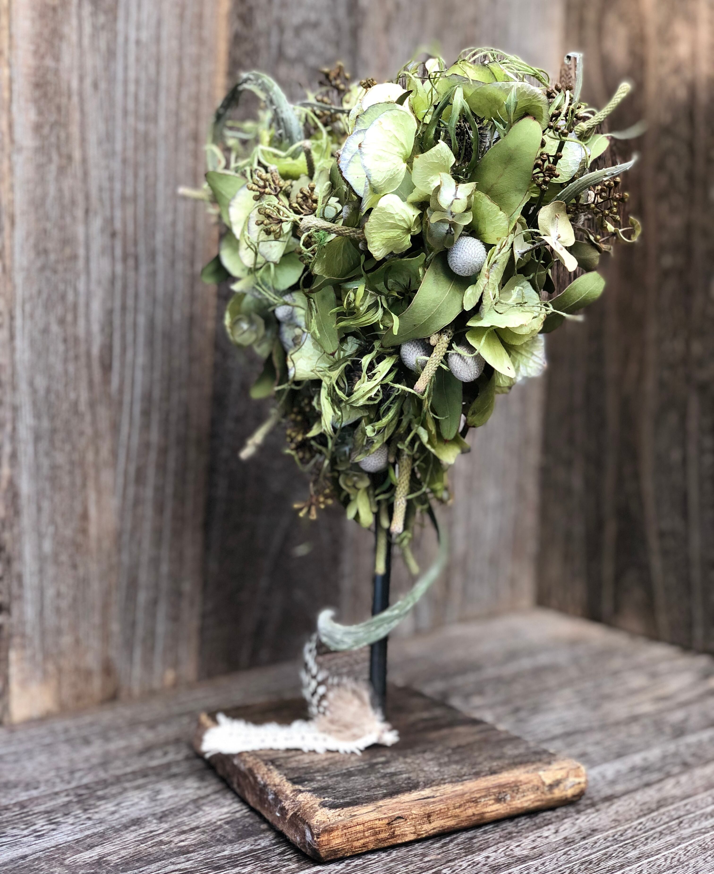 それを蜜蝋コーティングしたリサイクルウッドの土台に鉄の棒でトピアリーにしてます