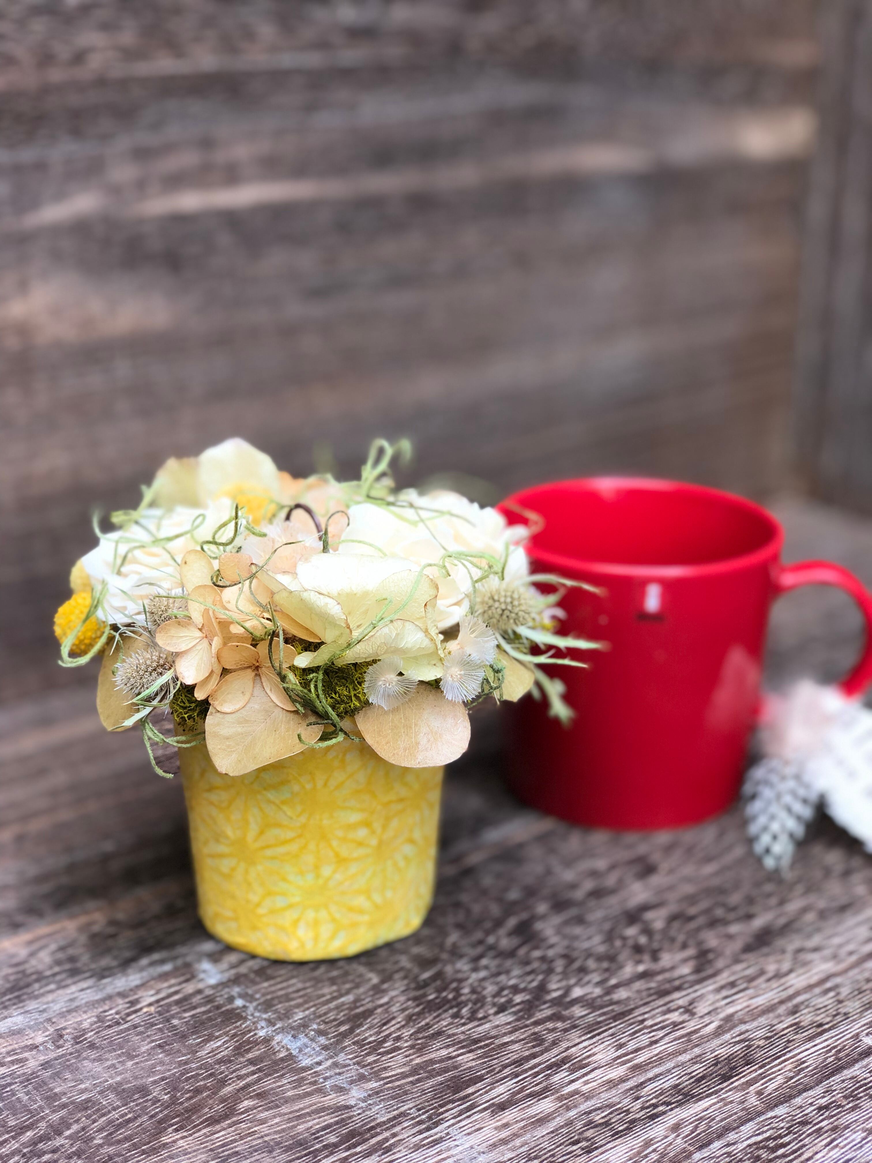 アレンジメントのベースは和紙をはりあわせて制作してるので、マグカップからはずして飾ることもできるんです