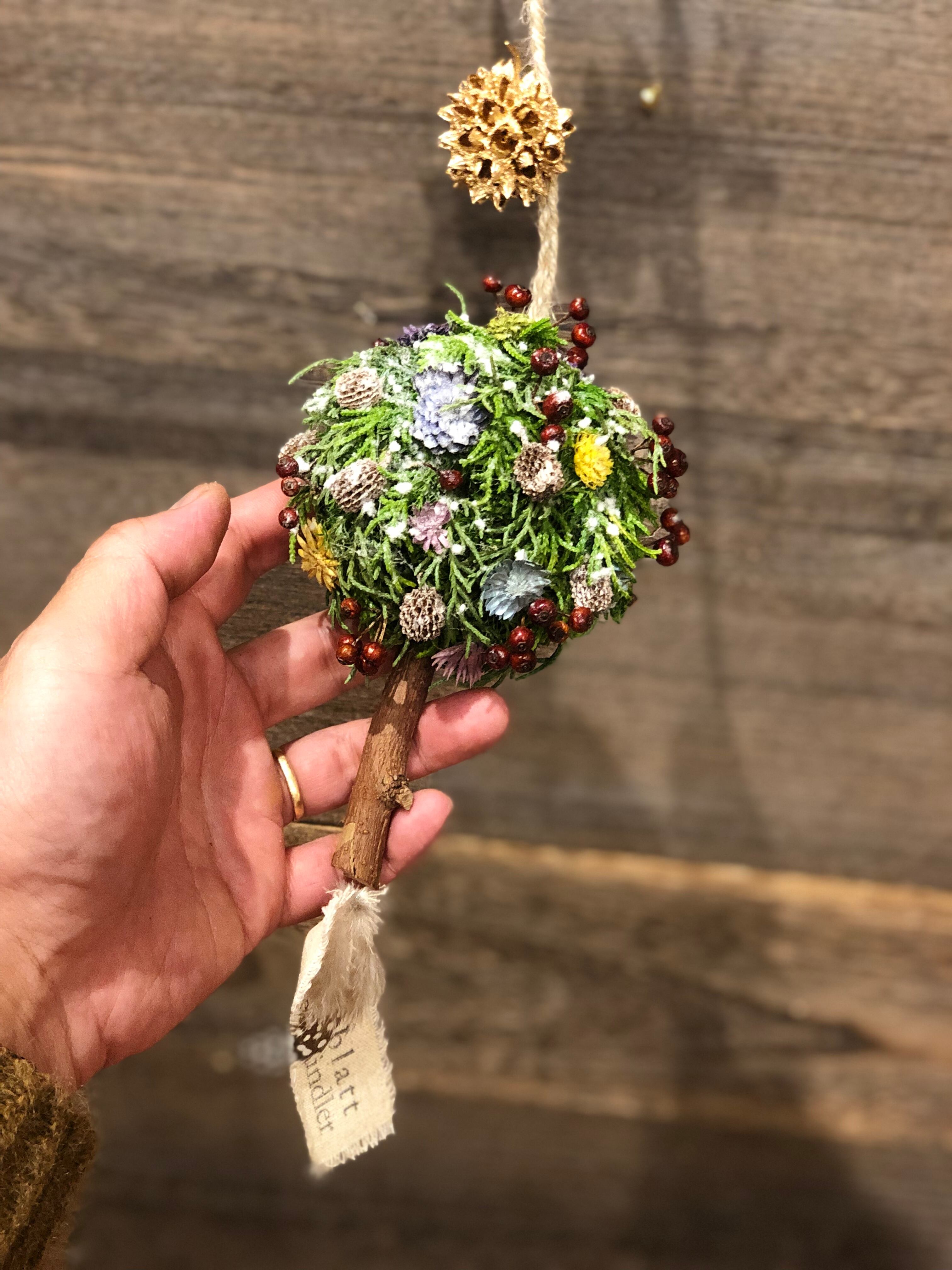 まぁるい木にカラフルな飾り実をあしらったガーランドです